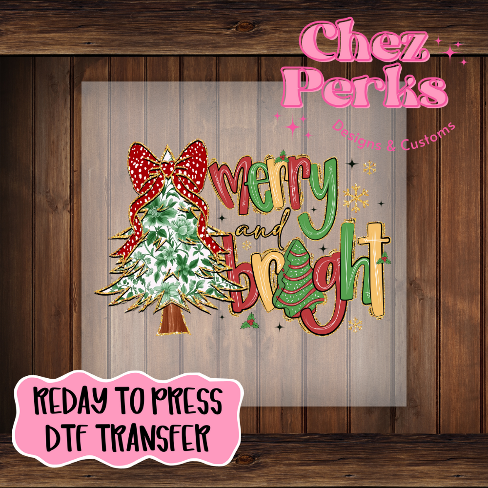 Merry and Bright Green Floral Christmas Tree DTF TRANSFER