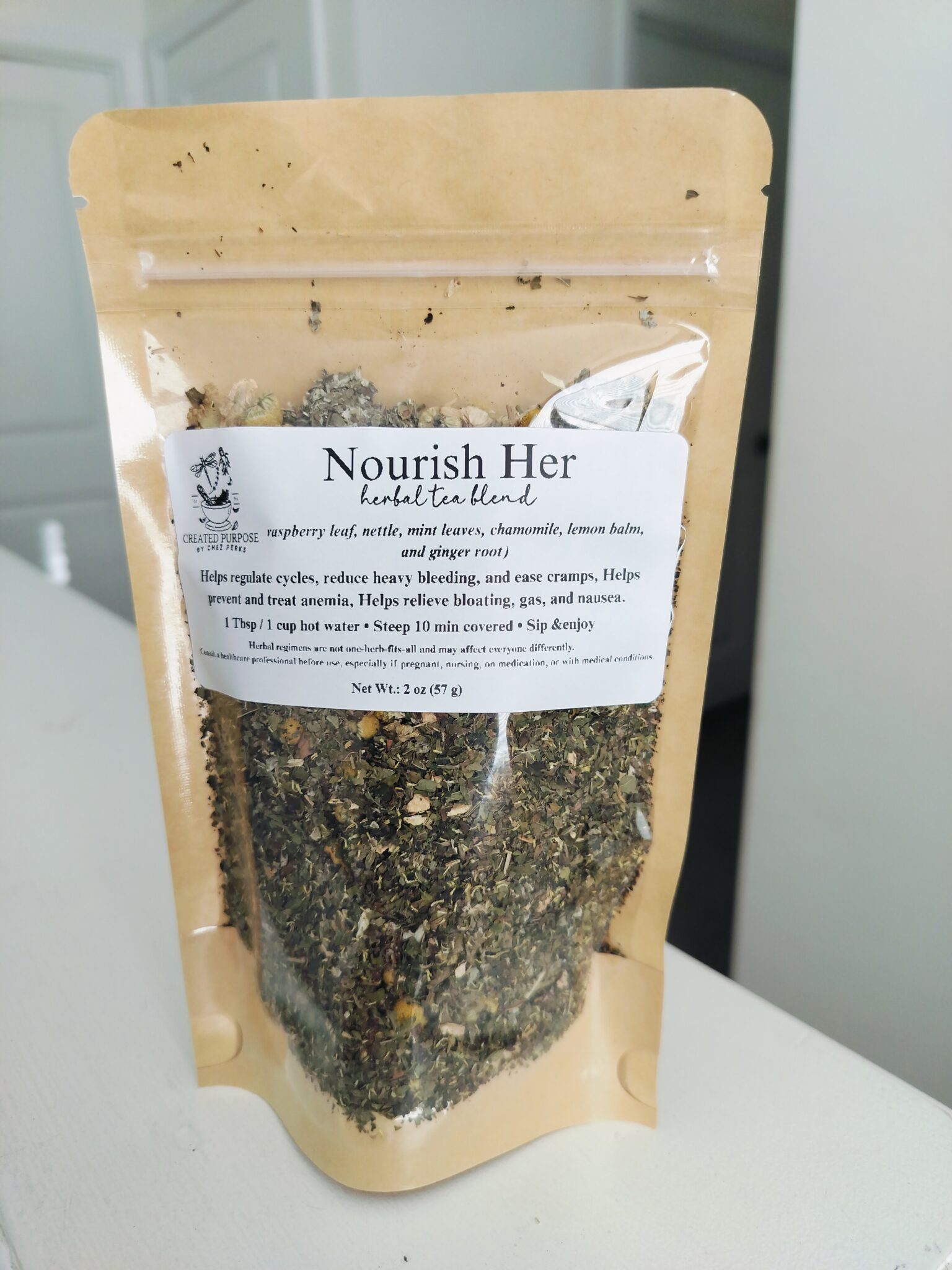 Support your cycle naturally with NourishHer — a gentle, mineral-rich tea crafted to ease cramps, balance hormones, and promote overall feminine wellness. This soothing blend of red raspberry leaf, nettle, and calming herbs helps restore comfort during menstruation and supports women’s health through every stage, including PCOS and menopause. Lightly minty with soft floral notes, it’s the perfect daily cup for harmony and strength.